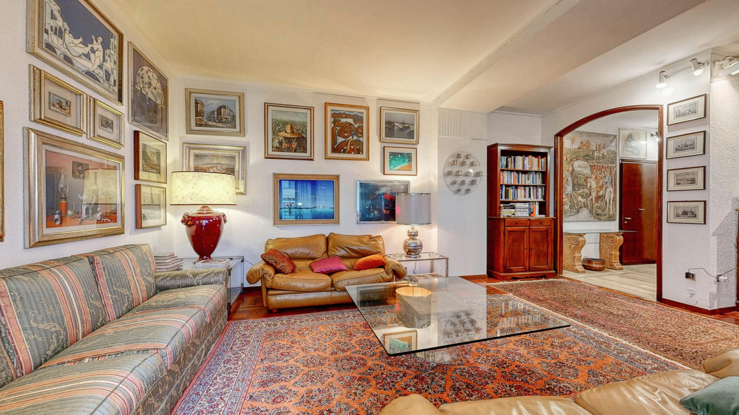 La dimora sita in Via Masera 10 si trova al 3 piano di uno stabile di 4 piani ed è composta da ingresso, salone doppio con balconata e ampie vetrate che regalano luce naturale alla zona relax che vede divani, libreria e sedute. L’ampio salone accoglie inoltre la zona pranzo che, sebbene inserito nel medesimo ambiente, risulta discreta e spostata rispetto allo spazio divani.